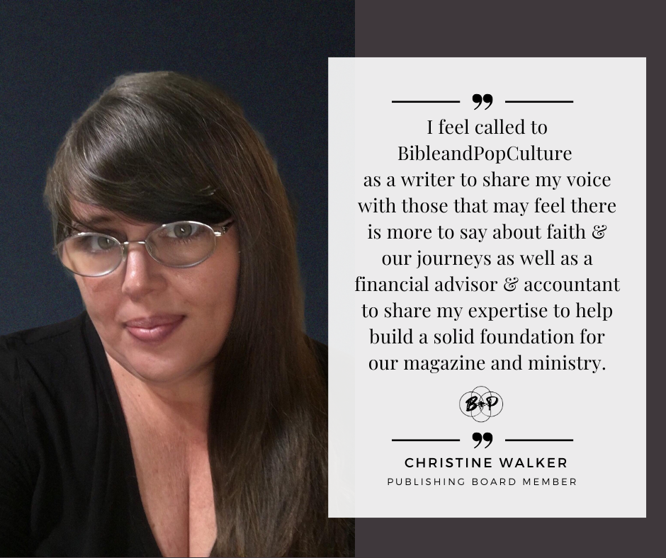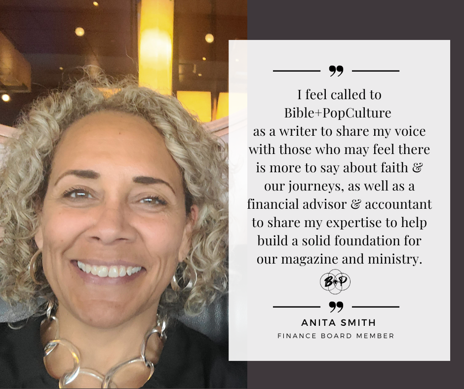 Anita recently transitioned to the Tampa Bay area + is looking forward to spending more time writing a children’s book + being on the hunt for a new church. She enjoys travel + absolutely adores her twin grandchildren Eli + Analise. Anita feels called to Bible + Pop Culture as a writer, “in order to share my voice with those that may feel there is more to say about faith + our journeys” as well as our financial advisor + accountant in order to share her accounting expertise to help build a solid foundation for our magazine + ministry.